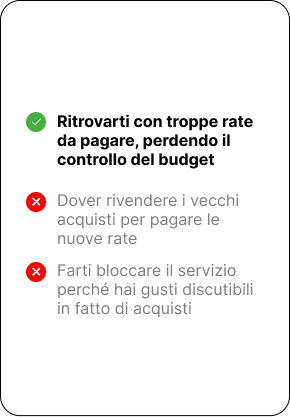 Il “Compra ora, paga dopo” non prevede la sospensione del servizio per il tipo di acquisti che fai e non ti obbliga a rivendere i vecchi acquisti se non riesci a pagare le rate: il vero rischio è perdere il controllo della somma delle rate da rimborsare.