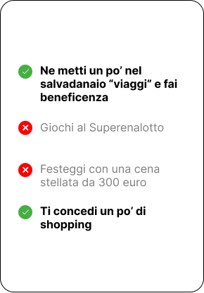 Ultima domanda, dai il meglio di te! Hai risparmiato più del previsto, e ti avanzano 150 euro a fine mese. Come li usi? Trova le 2 risposte corrette.